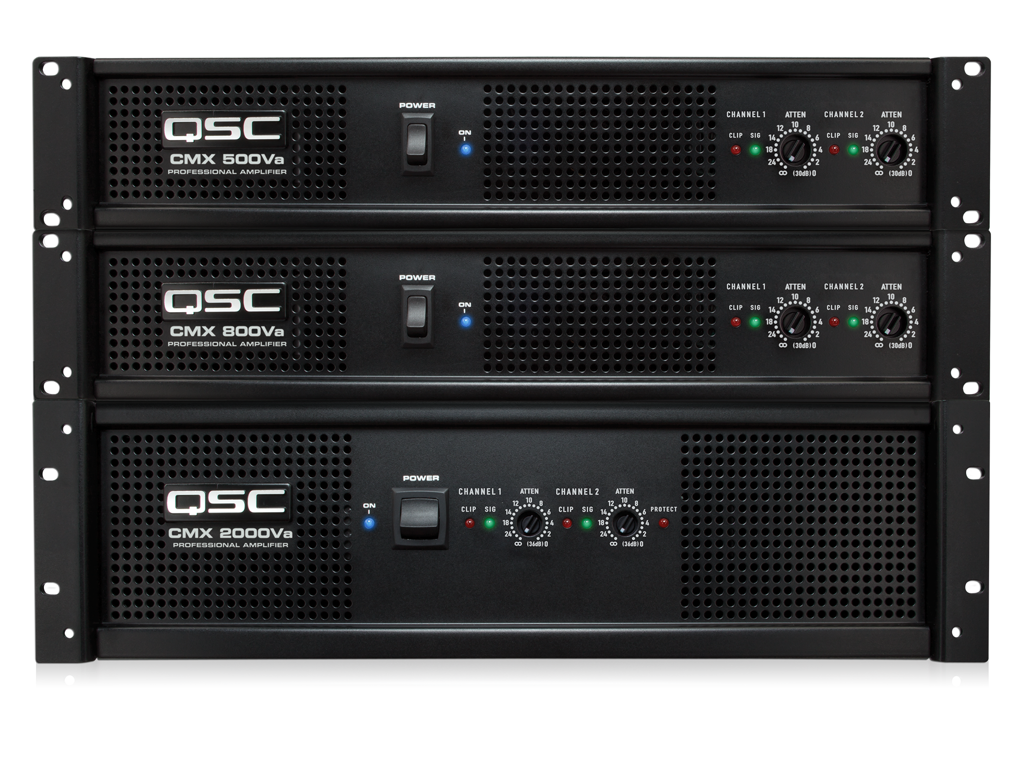 バリューCMXaシリーズのコントラクター/インストールアンプの3つのモデルの正面スタック画像