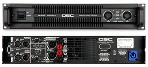Front and rear views (small) of PL325 and PL340, high-performance two-channel power amplifiers with DataPort network interface